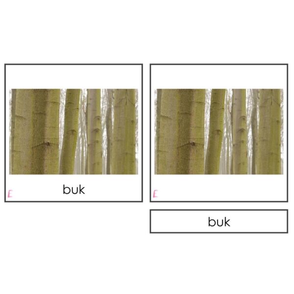Oferta składa się z 4 zestawów kart (karta z obrazkiem i podpisem, karta z obrazkiem plus podpis) oraz kartę kontrolną z nazwami drzew.