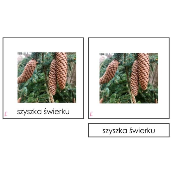 Drugi zestaw – drzewa iglaste plus ich igły i szyszki.