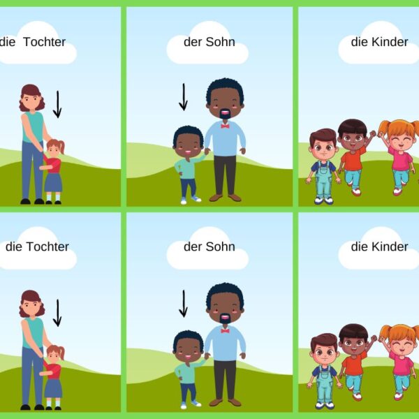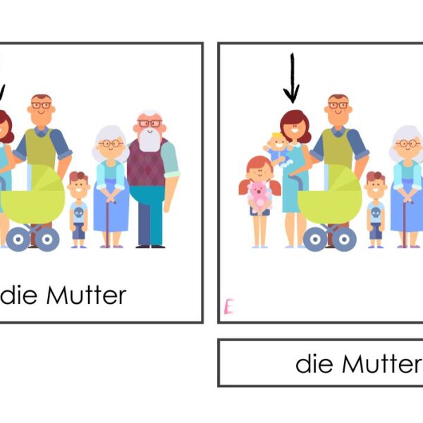 Karty trójdzielne Montessori z zaznaczonymi poszczególnymi nazwami członków rodziny w języku niemieckim