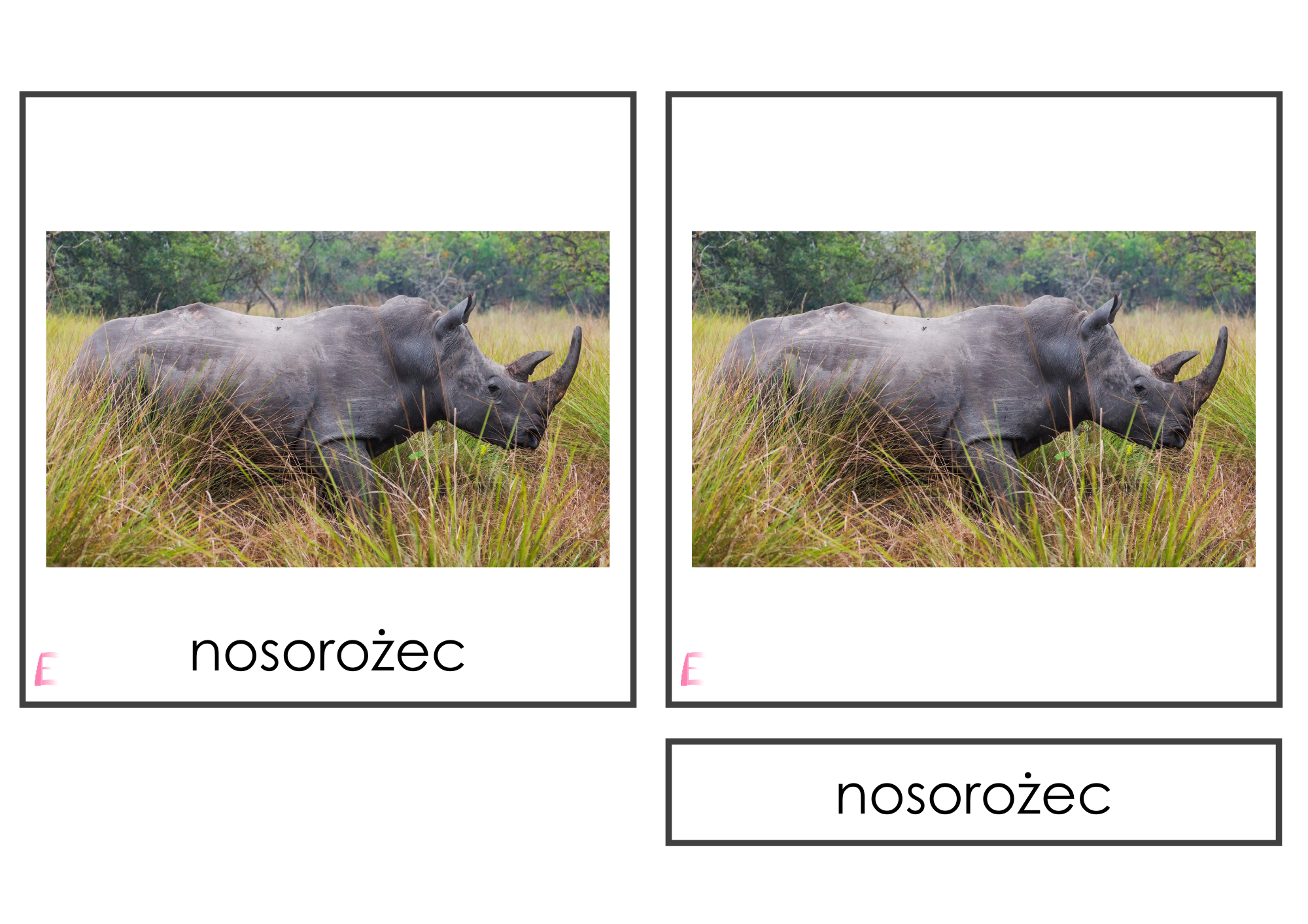 Oferta zawiera 18 zestawów kart (karta z obrazkiem i podpisem + karta z obrazkiem + podpis) oraz kartę kontrolną z nazwami zwierząt (słoń afrykański, lew, żyrafa, gepard, nosorożec, hipopotam, zebra, pelikan, hiena)