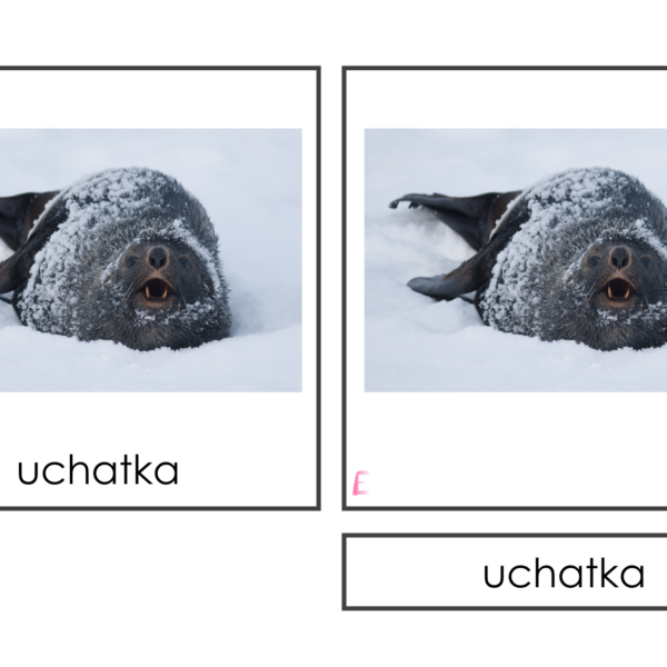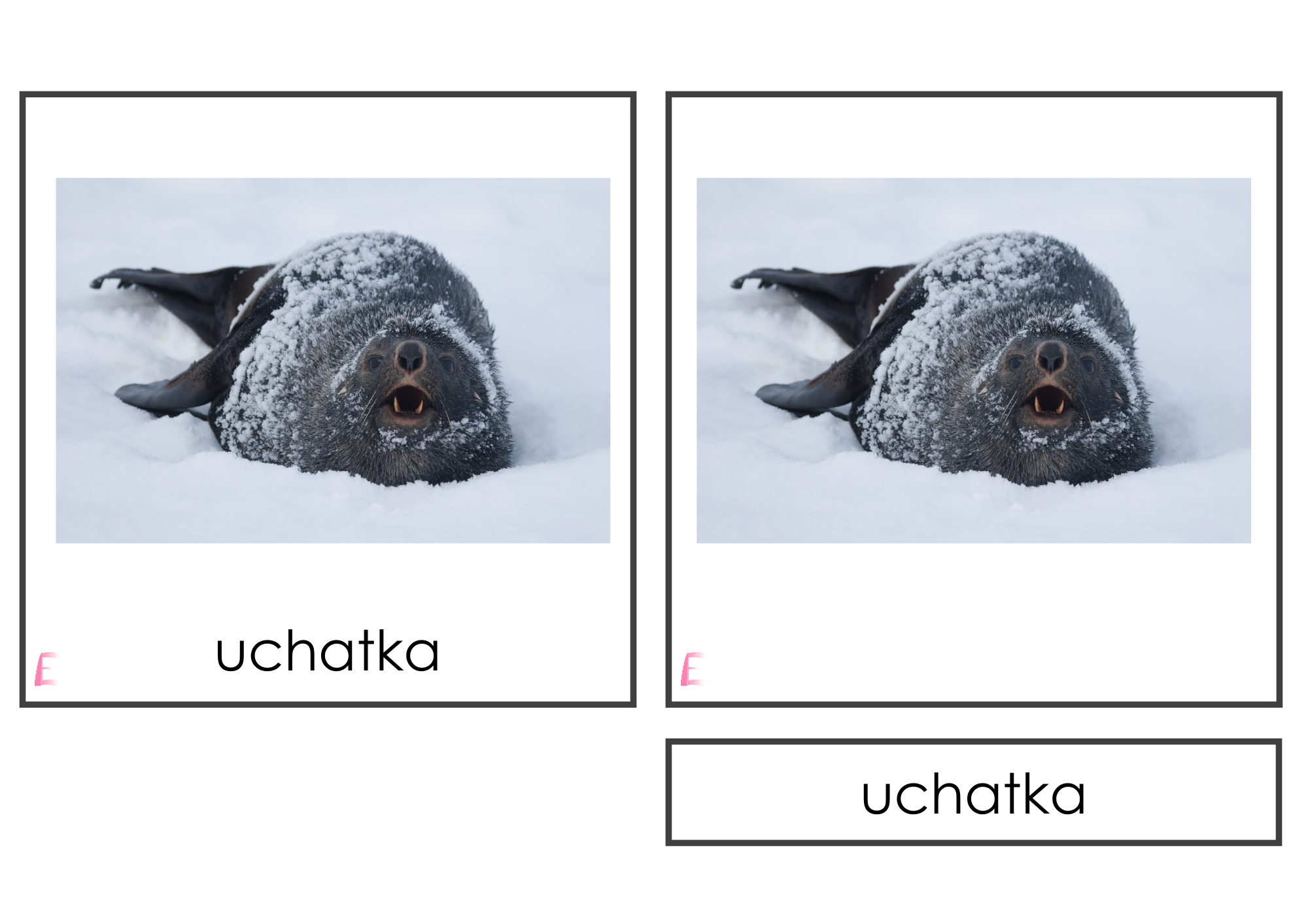Karty trójdzielne Montessori ze zwierzętami Antarktydy i ich młodymi. Dzięki nim wprowadzisz nowe pojęcia, zwiększysz, wzbogacisz i poszerzysz słownictwo dziecka wg lekcji trójstopniowej Montessori.